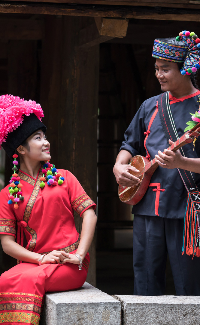 云南壯族主要聚居在文山州,人口114萬,民間的村寨大多依山傍水。壯族擅長(zhǎng)種植水稻,有太陽(yáng)崇拜和長(zhǎng)老崇拜的風(fēng)俗,視銅鼓為重器,厚愛銀飾,善烹制五色花米飯,能歌善舞,熱情好客。進(jìn)入景區(qū)壯族村,迎面有祭祀龍王的龍柱,兩邊是先民繪制的天王崖畫和為紀(jì)念傳說洪水泛濫時(shí)幫助先民度過劫難而建的石葫蘆亭。祭祀玉皇大帝的昊天閣和傳說能驅(qū)邪納福的碩大銅鼓聳立在廣場(chǎng)兩側(cè)。桿欄式和麻欄式民居、壯族青年社交休憩的“情廊”、村...